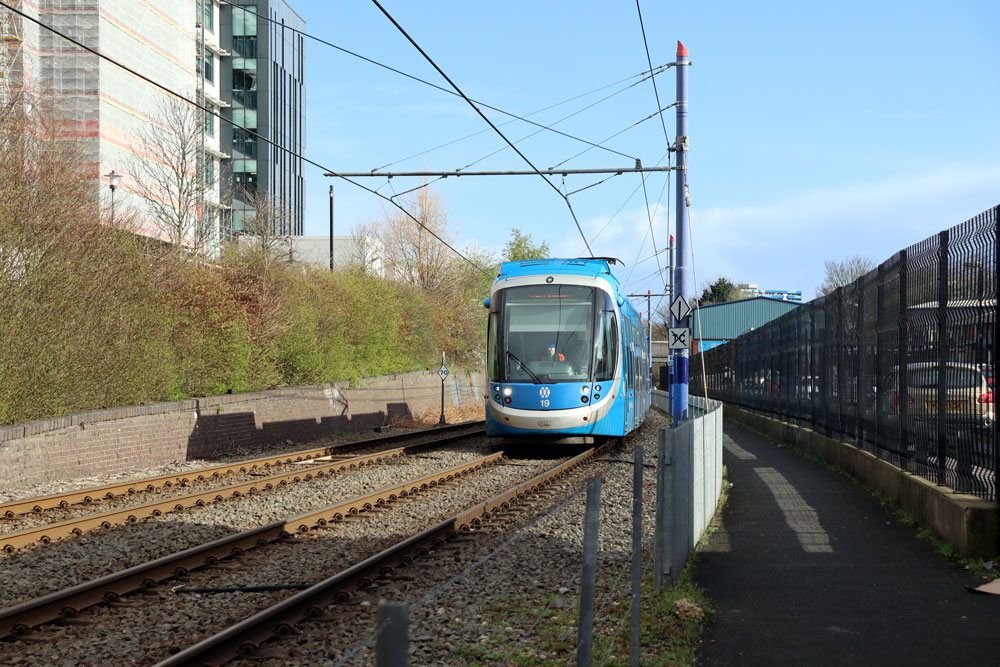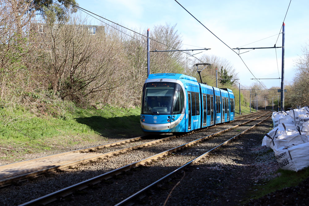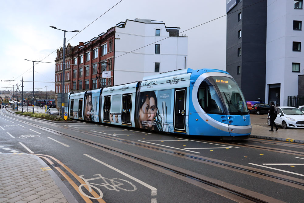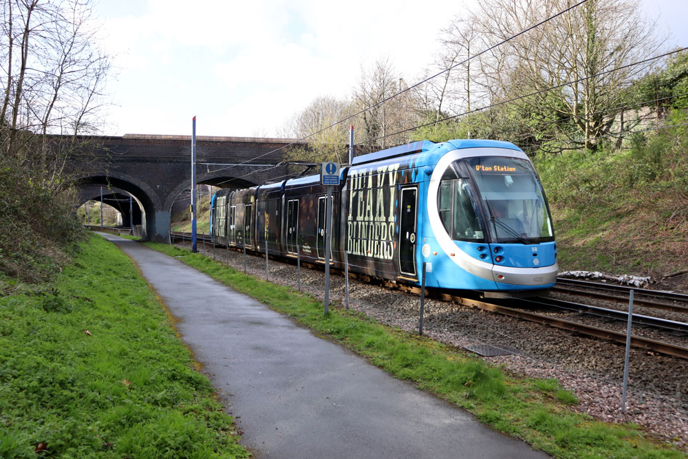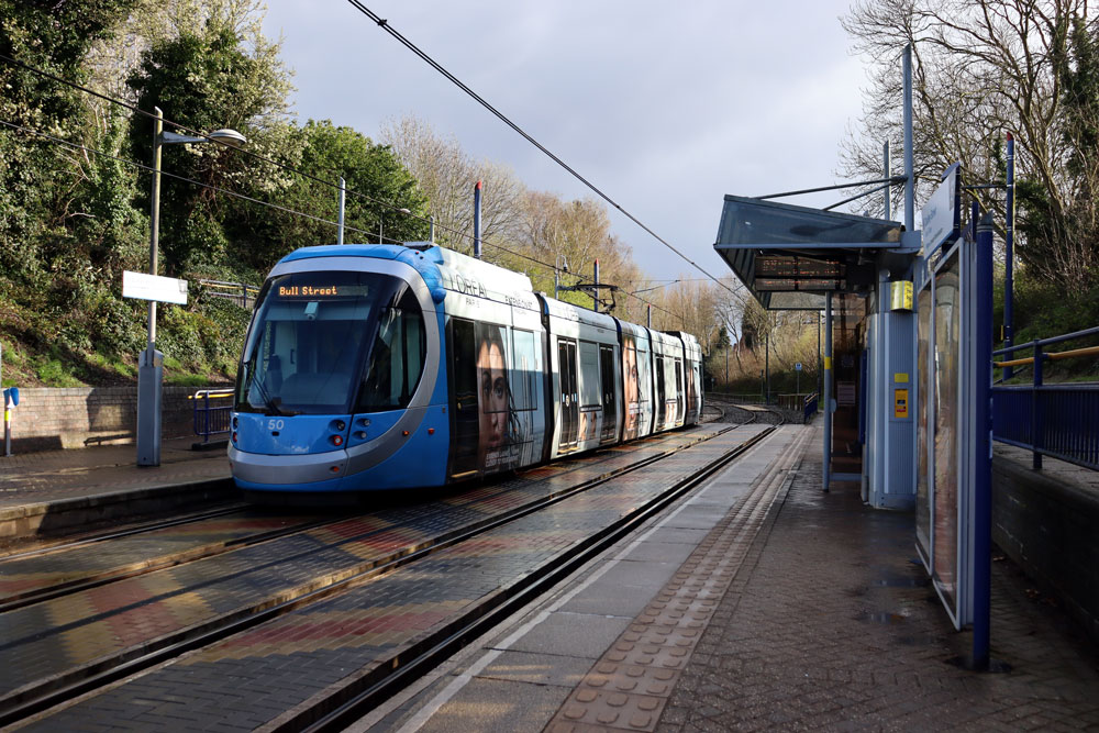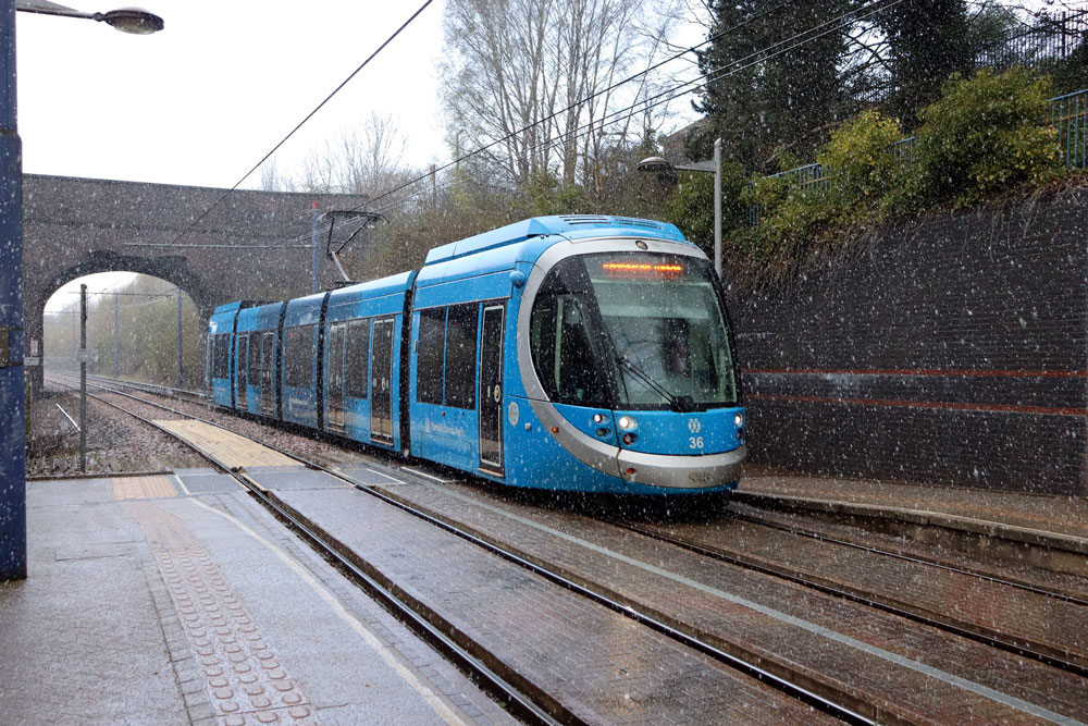 As well as photos on the extension we also visit various other stops on the open network to see those trams in service. It was mainly the newer Urbos100s which were operating on this day (in fact there were no trams in the 20s running at all!) and we see many of these in action. This includes the four trams in advertising wraps: 47 for Xero, 50 for L'Oreal, 52 for City of Birmingham Symphony Orchestra and 58 for Peaky Blinders. This was a bitterly cold day (despite it being Spring!) and as well as periods of sun there were also short sharp hailstorms to contend with! |