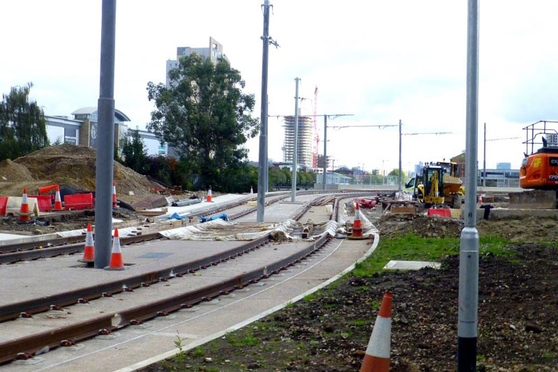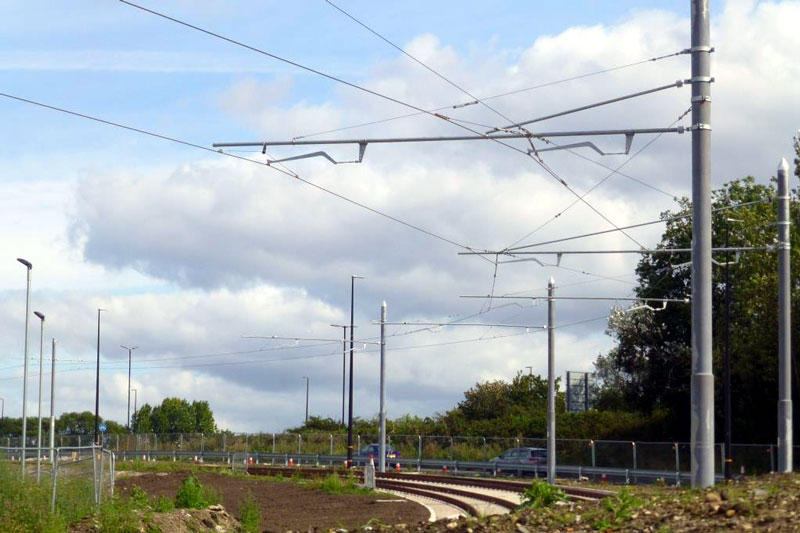 | In this latest update from the Manchester Metrolink Trafford Park extension we once again take a walk along the line to see the latest progress and once again there has been quite a bit! Much of the overhead wiring is now in place with two long sections now up. This includes one from the Trafford Centre to a point just before the line crosses Parkway for around 1700 metres and one of approximately 2000 metres from the middle of Parkway Circle through to just outside the Imperial War Museum North. And since these photos were taken there has been further progress in the erection of the overhead. The line is scheduled to open in the first part of 2020. |