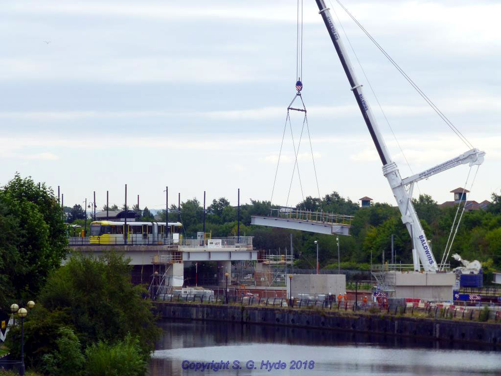 The best view was available from Trafford Road looking east towards Pomona stop and here we see one of the sections being craned into place as 3094 passes over the newly installed junction on its way to Eccles via MediaCityUK.