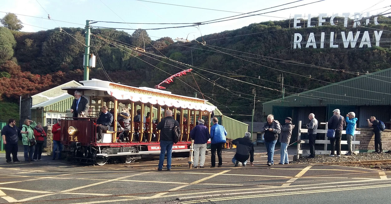 This photo shows 14 – being driven by Ian Longworth, Director of Public Transport – doing the honours as he drives the tram out of Derby Castle Sheds to drop down to Derby Castle terminus for the launch and first run. (Photograph by Jim Smythe)