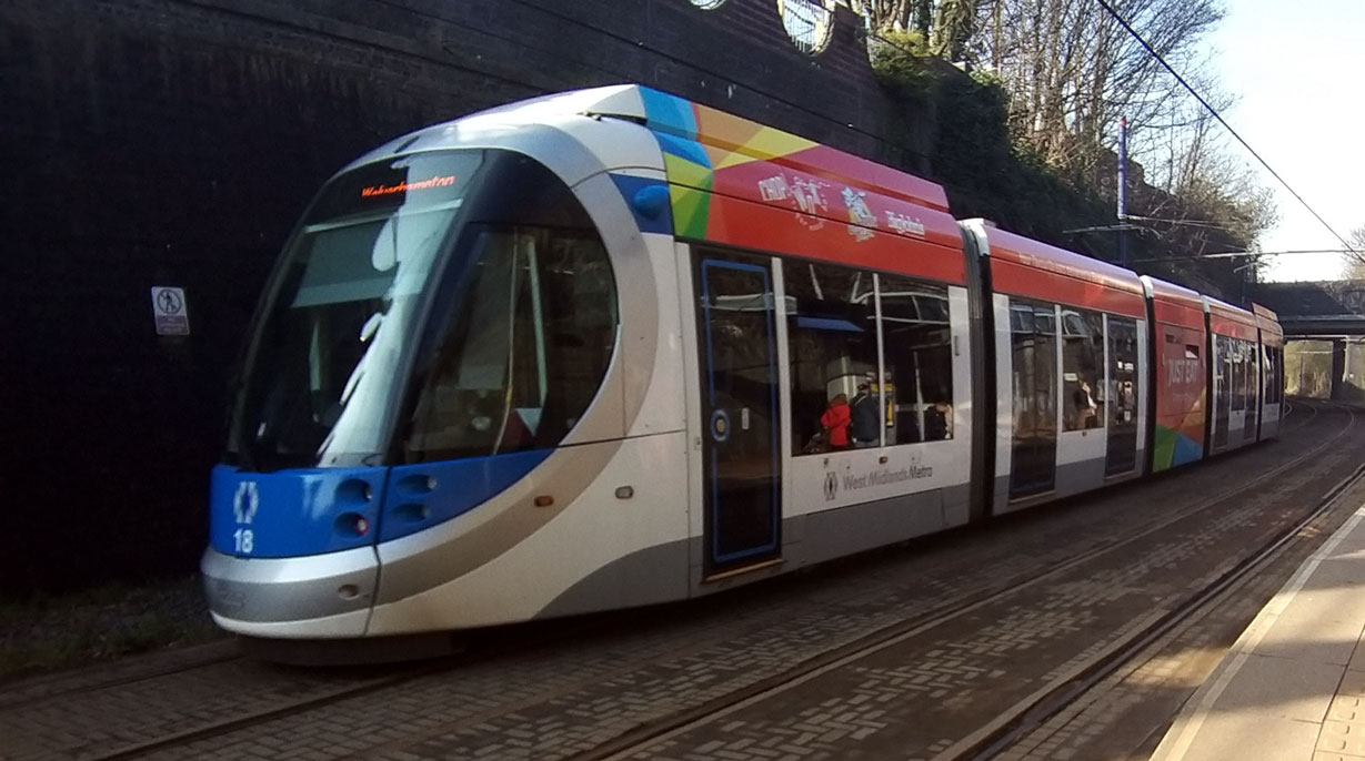 18 pulls away from Bilston Central (passing the Birmingham bound stop) with a service to Wolverhampton St George’s showing off its new Just Eat advert.