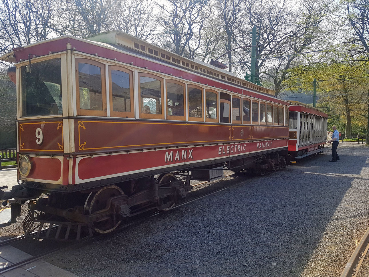 Having been used on the parallel run and then motorman taster lessons the previous day, Tunnel Car 9 was back on timetabled services on Saturday 20th April along with trailer 42 . The two trams are seen here at Laxey.
