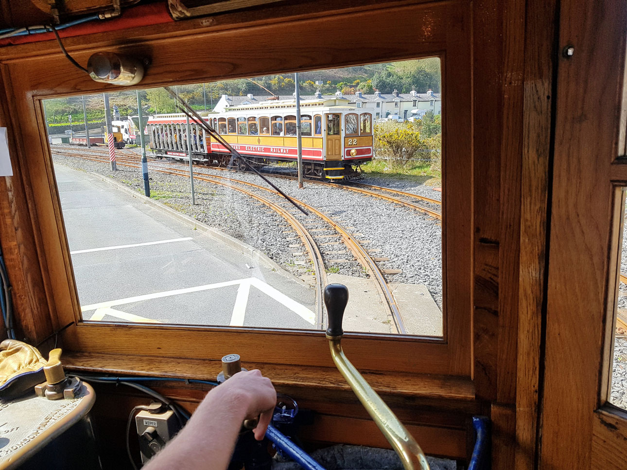 This time we are definitely looking through a rectangle window – the windscreen of 7 – at Winter Saloon 22 and trailer 47 as they pull away from Laxey. (All Photographs by David Maxwell, 20th April 2019)