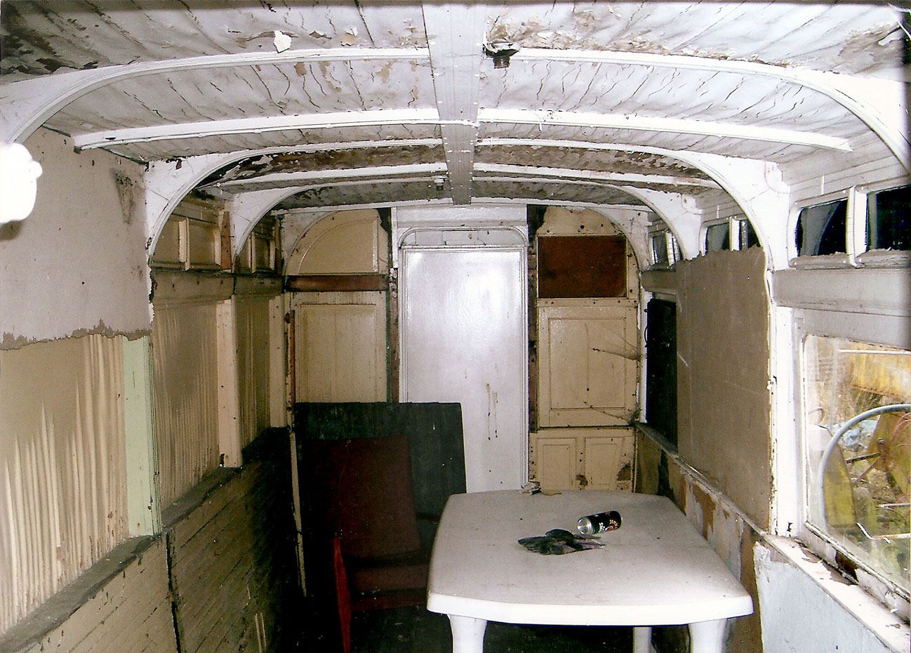 The interior of one of the trams complete with table, chair and an empty can of beer!