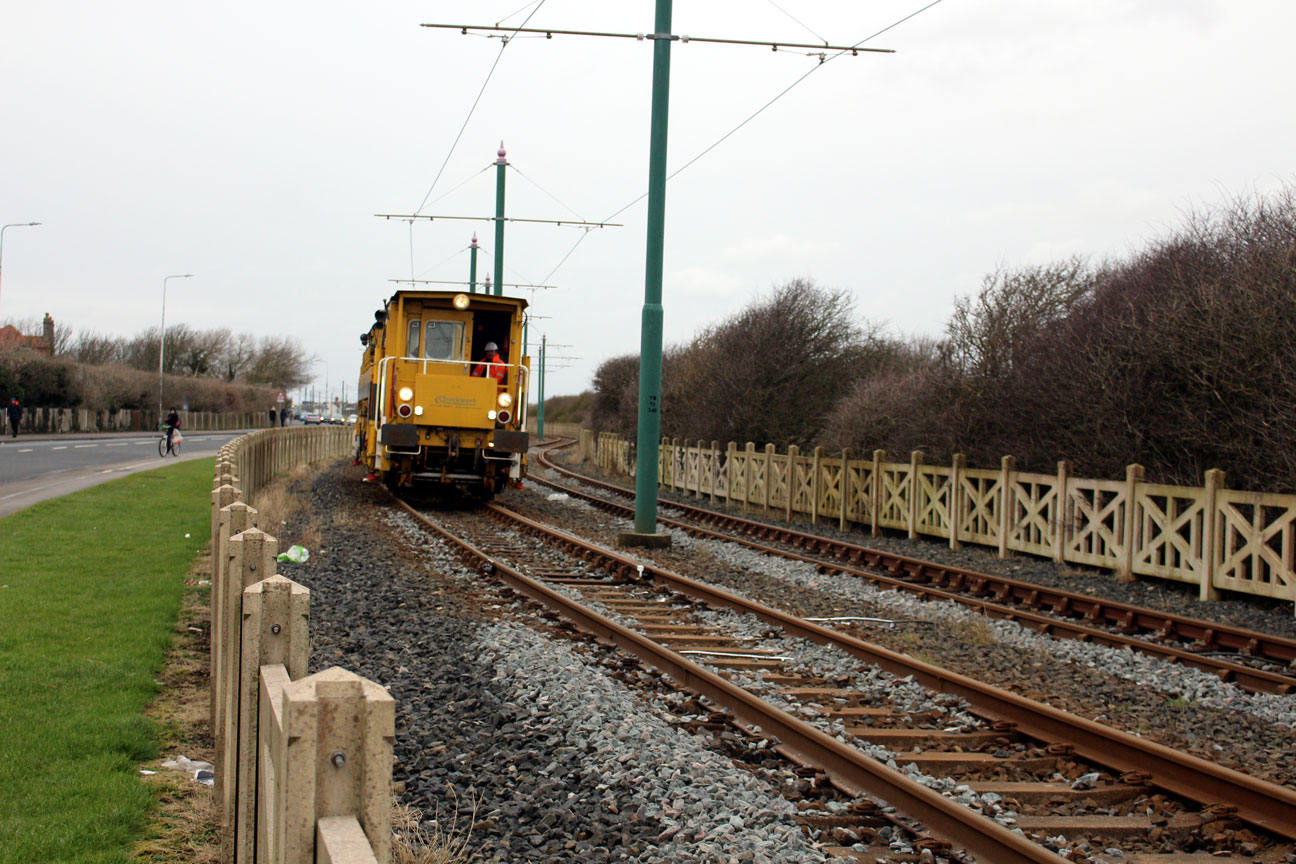 The tamper – which has been in Blackpool since the start of the week and we previously saw it at use south of Little Bispham – is seen at Rossall heading south on the northbound track having previously gone north on the same track.