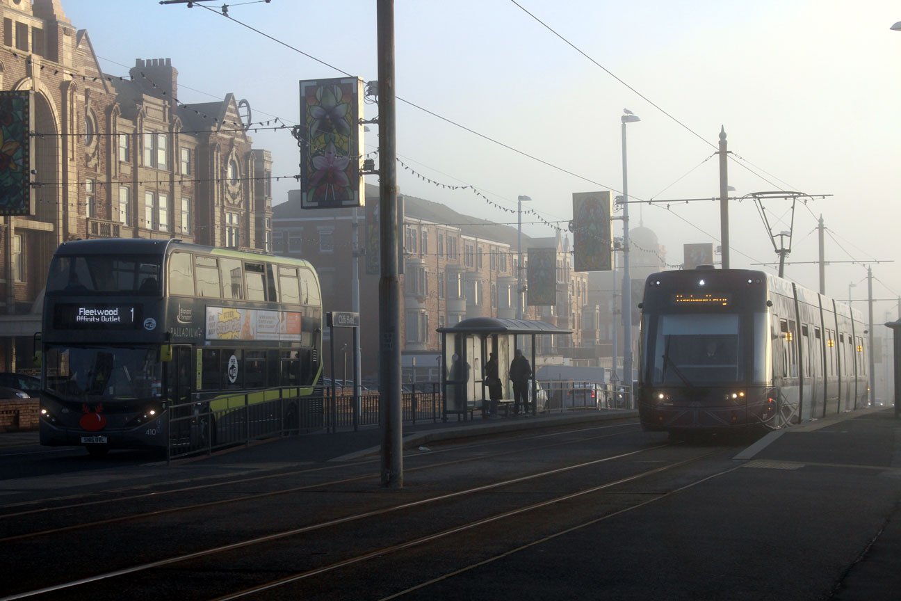 With the sun trying to breakthrough 017 calls at Cliffs Hotel when heading north. The no. 1 bus alongside has a red nose! (All Photographs by Tony Armitage, 19th December 2021)