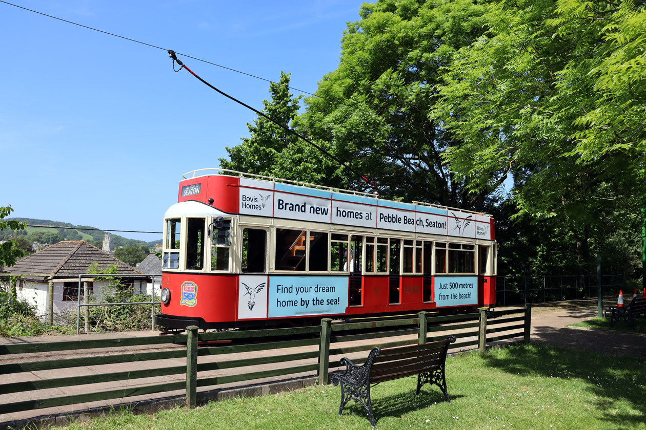 Then on 27th May 2023 and we see 12 again, this time at the other end of the line at Colyton. The tram is still in the same red and cream livery but in the intervening years had spent some time in a special 40th anniversary livery. The tram again has adverts for a housing development – a different housing development! – and they aren’t only in between decks but also below the windows as well. (Both Photographs by Gareth Prior)