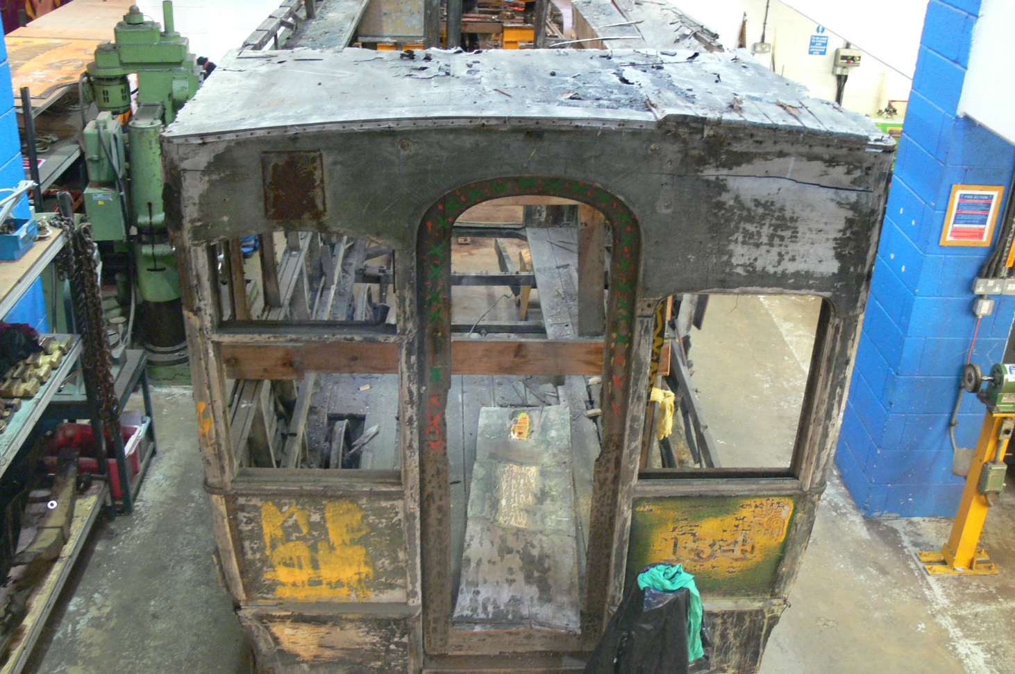 A close look at one end of the North Metropolitan horse tram body in the workshop at Crich, seen from the viewing gallery on 1st February. (Photo by Andrew Waddington)