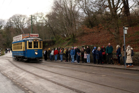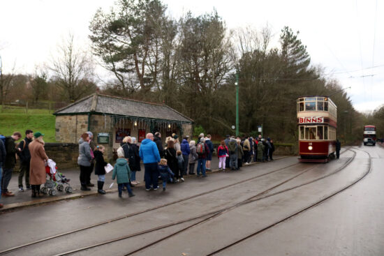 Saturday 14th December 2024 was a very busy day at Beamish with messages released on social media that the car parks were full and that they were introducing a one car in, one car out policy. That, of course, meant that inside the museum it was very busy and here we see a long queue at the Entrance as visitors wait to be allowed to board Sunderland 16, which at least will have a larger capacity to allow may of them to head down to towards the town.