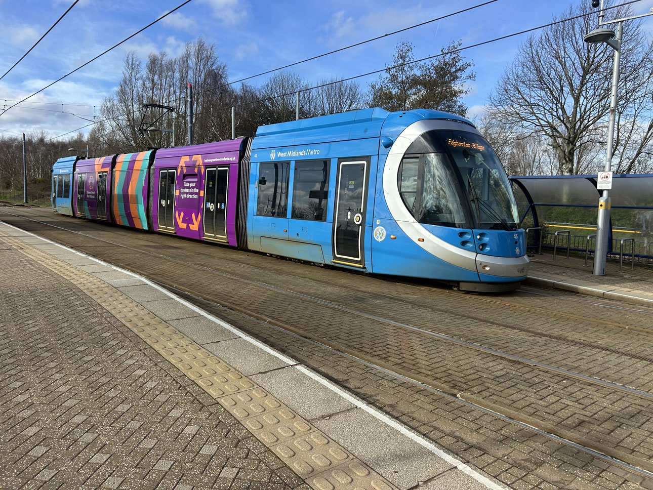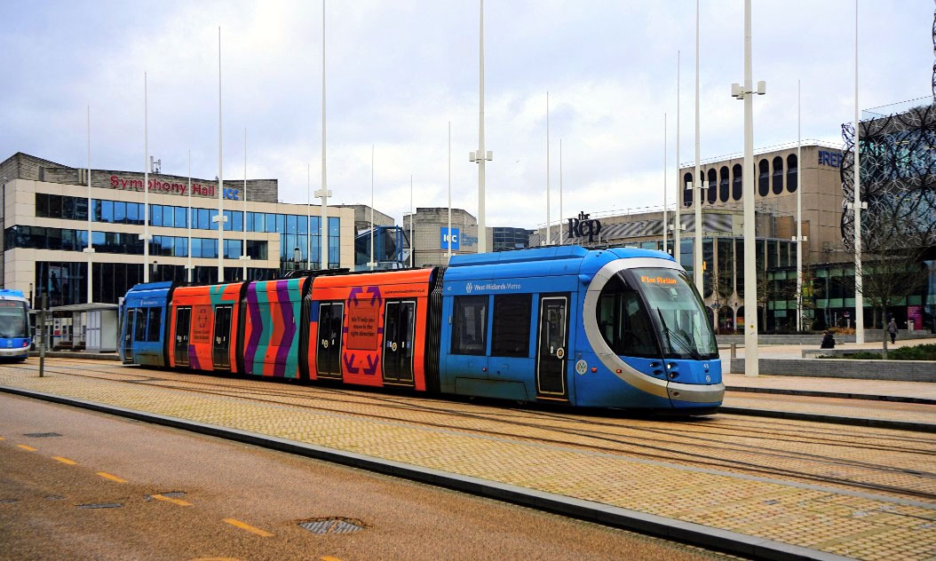 But the total number of adverts doesn’t change as 43 has become the 13th of the Urbos100 trams to have carried some form of external advertising. This advert is in a similar style to that seen earlier this year for the West Midlands Business Festival, in that it only covers the centre three sections of the tram rather than the whole thing.