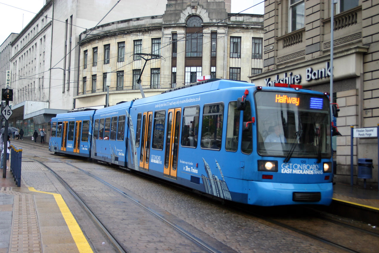 29th May 2010 and we’re at Fitzalan Square/Ponds Forge on what appears to be a damp bank holiday weekend (this being the Saturday). The tram arriving is 120 which is in an advertising livery for East Midlands Trains (both Supertram and the rail operator being run by Stagecoach at the time). This advert had been added to the tram in May 2009 and would remain in place until October 2010, at which point it would receive its popular Sheffield Corporation Tramways livery to mark 50 years since the end of the original tramway. On this date the tram was running on the Blue route with it heading to Halfway.
