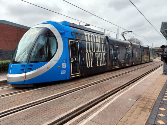 58 at West Bromwich Central in its Peaky Blinders livery. This end of the tram says “Home of the”. Also note the “Steven Knight” under the 25th anniversary logo. (Photograph by Mark Cufflin, 3rd March 2026)