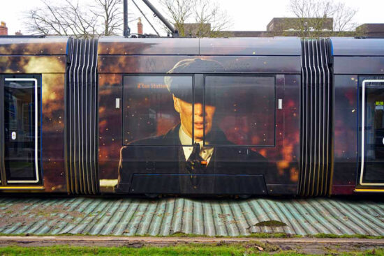 As well as the vinyls the tram is also now named “Steven Knight”, who is the creator of Peaky Blinders, which was originally broadcast on the BBC. A new film is being released at cinemas nationwide on 6th March and will then be available on Netflix from 20th March. The naming took place in Centenary Square on 2nd March (which meant that for a time on that day no trams ran Grand Central-Edgbaston Village) and recognises his commitment to championing Birmingham and the West Midlands on screen and his support for the region’s film industry.