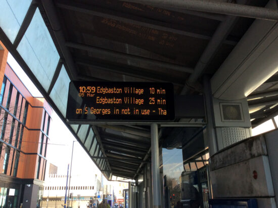 0700 to 1900: Trams every 15 minutes from Wolverhampton Station and Wolverhampton St George’s to Edgbaston Village. These will combine to give a tram every 8 minutes from The Royal to Edgbaston Village.