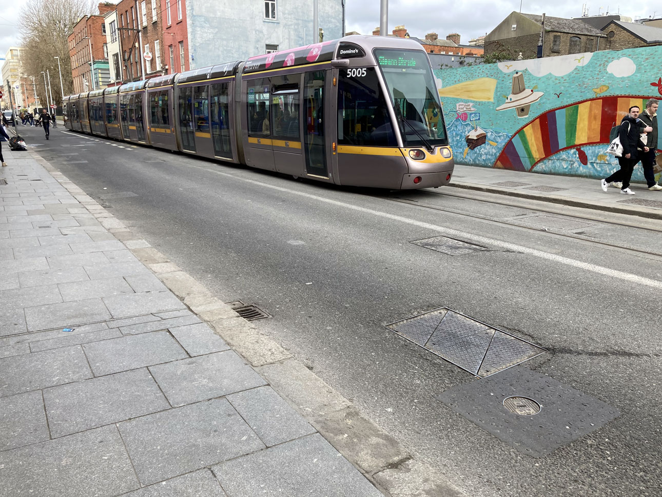 5005 is an older tram being part of the batch of Citadis 402 trams which were built 2009/10. This batch – which consisted of 26 trams – originally arrived from France as seven section trams but with additional capacity craved on the network they were extended to nine sections between 2019 and 2021. Its another tram with external advertising – Domino’s Pizza in this case – as it works a service to Gleann Bhride (or Brides Glen in English) which is the terminus of the Green line. (Both Photographs by Alan Absolom, 1st March 2026)