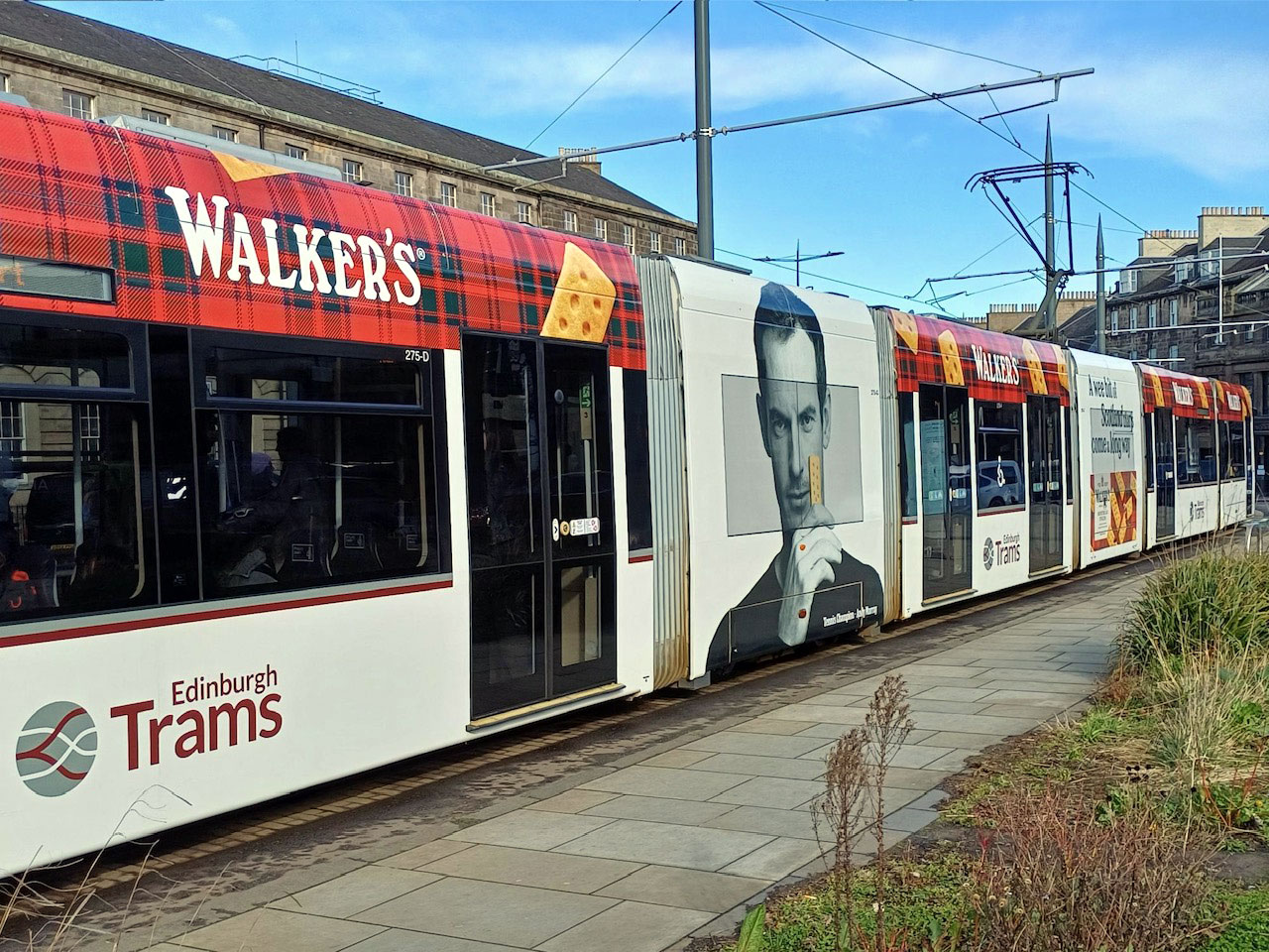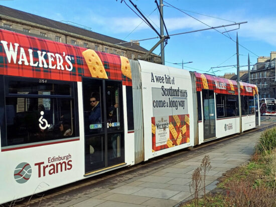 Having been the market leader in a ever-changing selection of adverts, 2026 has been a very quiet year for Edinburgh Trams with no all new adverts seen as yet (and we’re halfway through the third month of the year!). Indeed the only changes have been a few revisions to existing adverts – 251 which advertises St James Quarter, 254 advertising Uniqlo and 275 which carries vinyls for Walkers Shortbread. In this article we take a closer look at the current version of 275’s advert.
