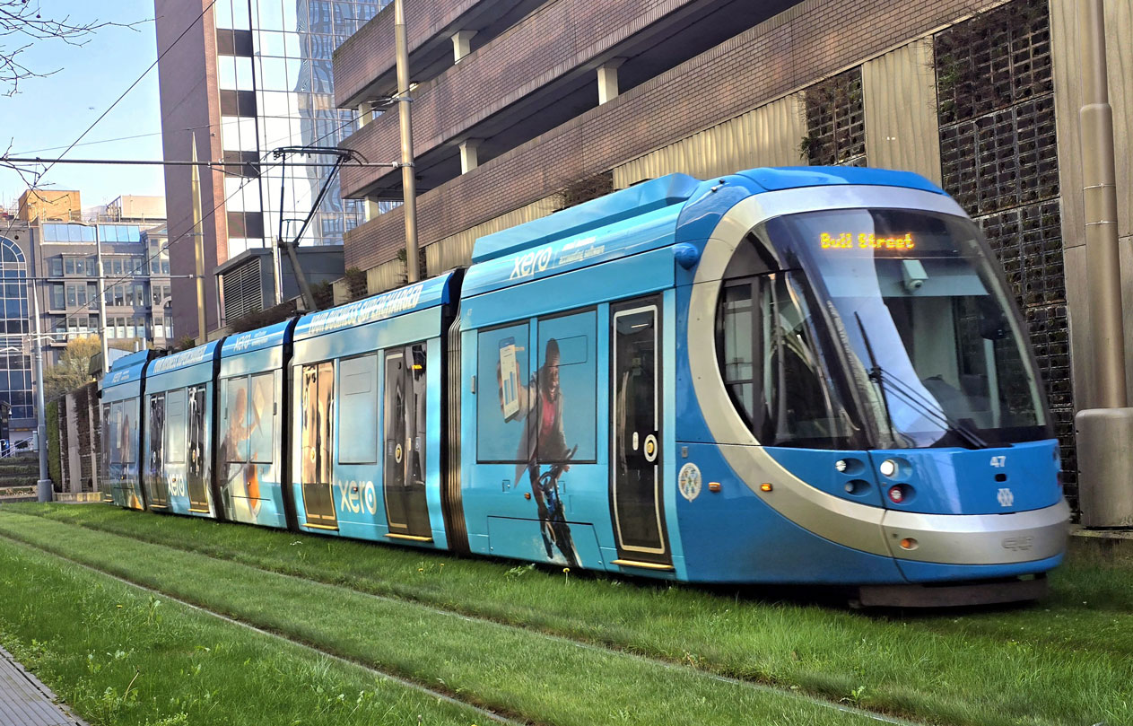 Despite claims to the contrary, 47 is seen here running to Wolverhampton St George’s on its first day in use with its new advert for Xero. The tram is about to arrive at St Chad’s as it runs along the grassed section of track alongside Birmingham Snow Hill Railway Station. (Photograph by John Binch, 21st March 2026)