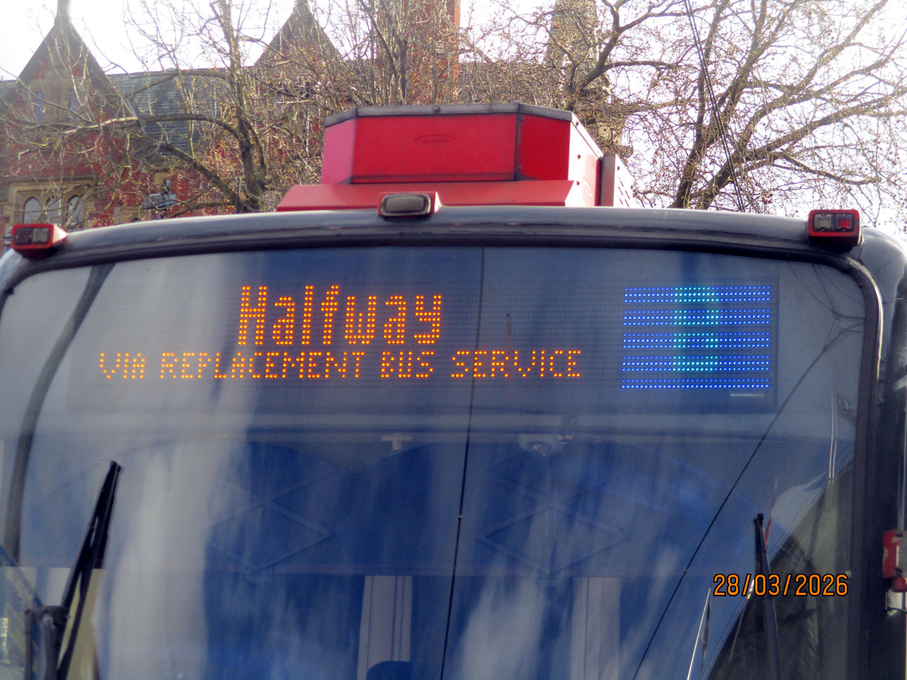 Trams on the Blue route (no Purple route trams are running for the duration) are still displaying Halfway on their destination displays, with the addition of “VIA REPLACEMENT BUS SERVICE”. The bus is starting from Fitzalan Square with anyone wishing to travel to stops as far as Gleadless Townend advised to change there.