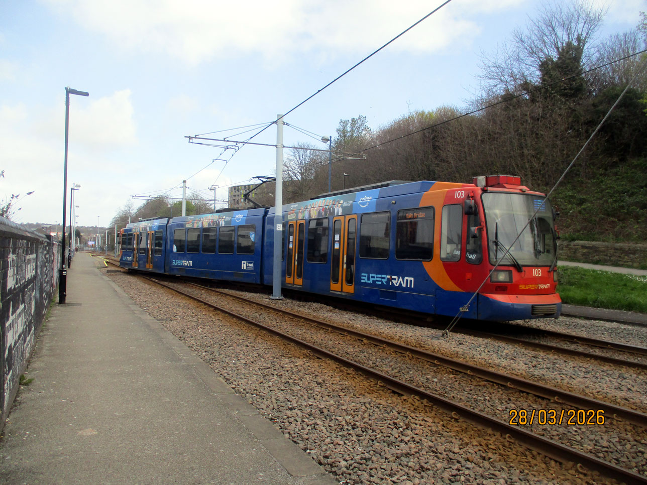 Trams then depart from the same platform and use the crossover to gain the correct track. 103 demonstrates the move.