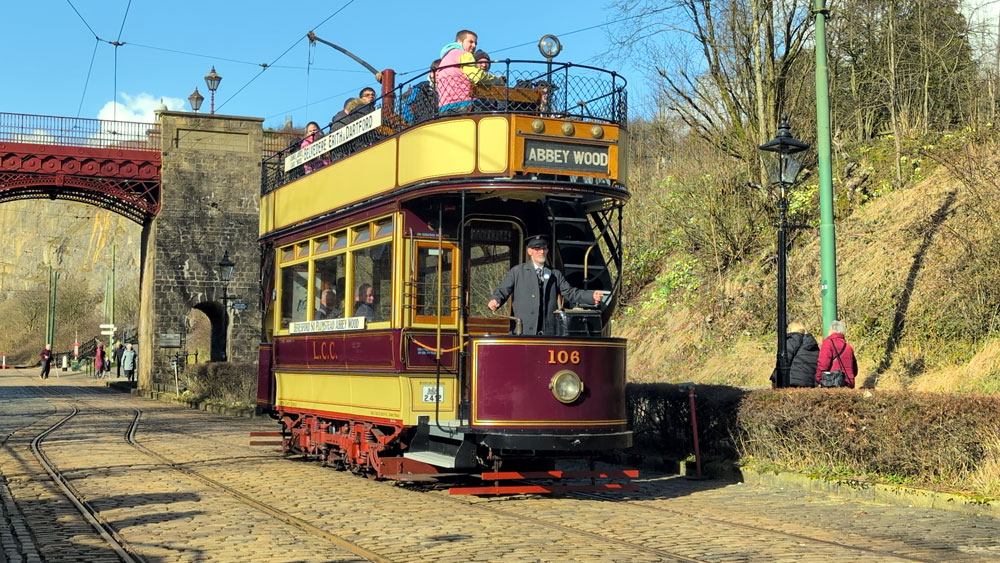 The National Tramway Museum reopened for another season on Saturday 14th March 2026 and with sunny weather one of the trams out on that opening day was London County Council 106 – a tram which has also seen extensive use since. In this shot we see 106 passing the depot entrance on its way back down to Town End after heading up the line. (Photograph by Steven Hughes)