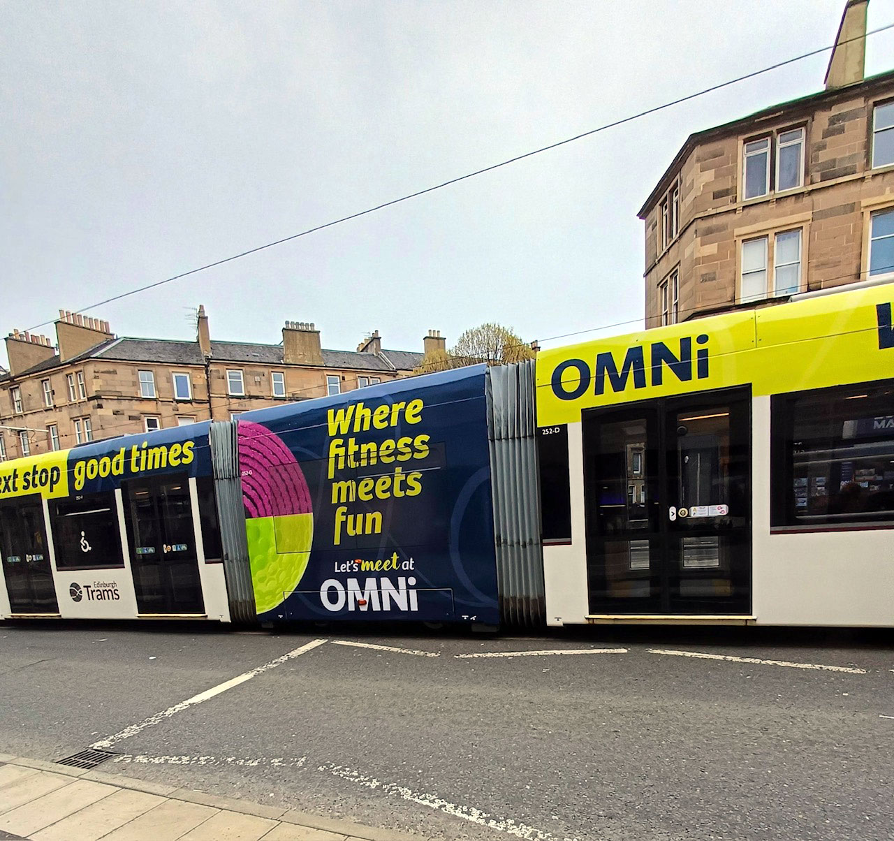 Edinburgh Trams 252 has received a new advert – in the “double T” style we have seen on many of the trams in the fleet over the years – with a new design for Omni Centre appearing from 1st April 2026. Often when we report on new ads in Edinburgh it’s the eight, ninth, even tenth but for 252 it is just the second different advert it has having been one of the long-termers promoting C R Smith.