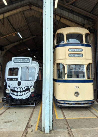 Blackpool 634 and Sheffield 513 were not in service but are seen stabled at the front of the depot. Both these trams are scheduled to be used during the first month of the season.
