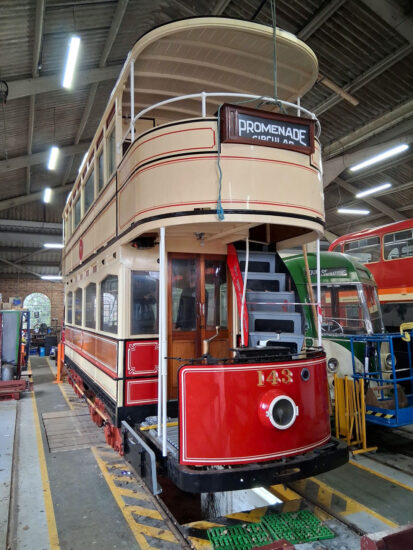 Newest tram arrival at the museum is Blackpool Standard 143. Since its arrival it has been moved into main tram depot where it is seen here over the inspection pit. Blackpool Marton VAMBAC 11 is just to the right.