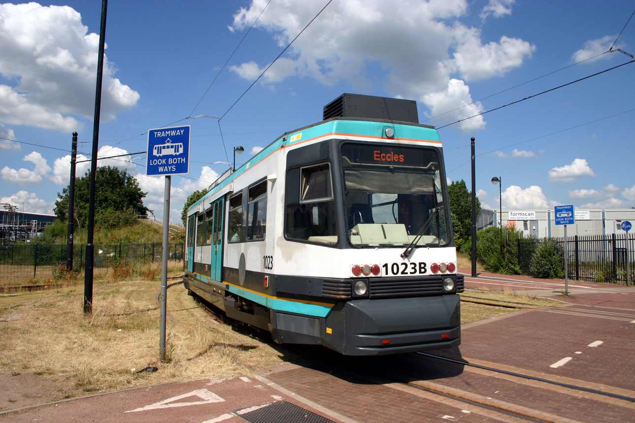 On 19th July 2013 it’s a sunny day in Greater Manchester as we see T68 1023 rounding the curve at the MediaCityUK junction as it continues its journey to Eccles. The access from MediaCityUK can just be seen on the centre left of the shot with the line from the Manchester direction onto the spur directly behind the photographer. 1023 would just have six months left in service with it being withdrawn on 21st January 2014. It has survived into preservation.