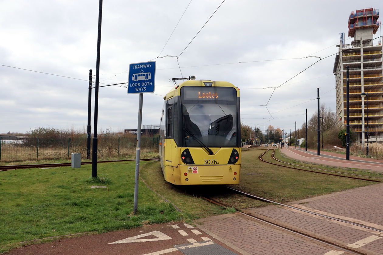 Then on 17th March 2025 we are in the same place as we see M5000 3076 also rounding the curve on the way to Eccles. As well as a change of type of tram there has been some development around the tramway here in the intervening 12 years (and indeed since this image was taken things have progressed further). With it being earlier in the year the grass is greener too and with the image being taken from a slightly different angle we can make out the MediaCityUK access track more clearly. (Both Photographs by Gareth Prior)