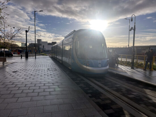 The sun comes out from behind the clouds as services start to Millennium Point with 55 having done the honours of carrying the very first passengers on the extension.