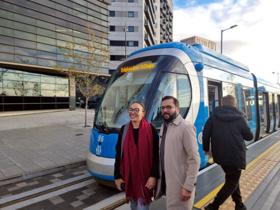 Sophie Allison, Managing Director of West Midlands Metro, and Sandeep Shingadia from Transport for West Midlands, pose in front of the first tram at Millenium Point.