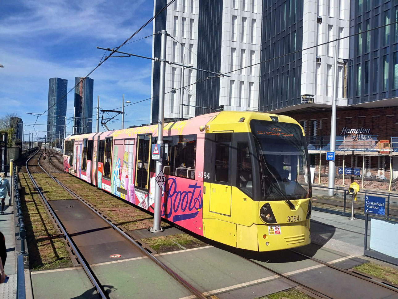 3094 arrives at a sunny Deansgate-Castlefield on its way to Shaw. The vinyls add even more brightness to the scene! Note that the tram is using the centre track at Deansgate-Castlefield, with The Trafford Centre service now extended through to Crumpsall this line is now more readily available for services running into the city centre.