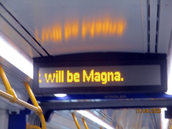 On-board one of the tram-trains and we take a look at the on-board passenger information display telling us that the next stop is Magna.