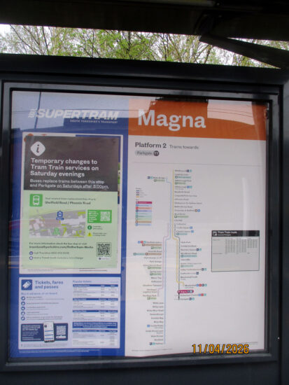 Magna stop signage including a helpful sign telling passengers where tram-train services will go from this particular platform.