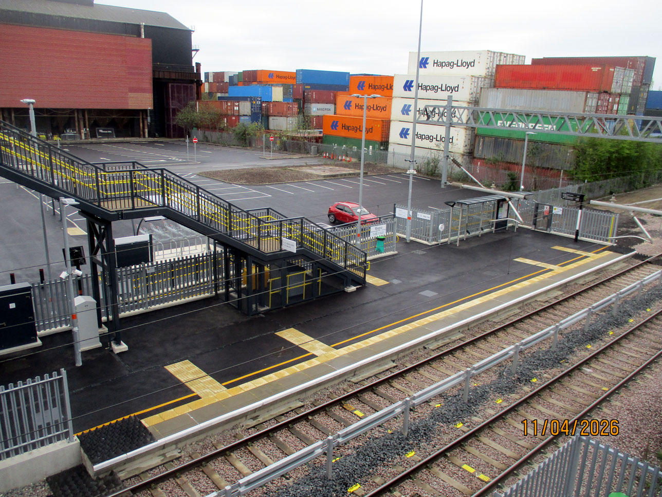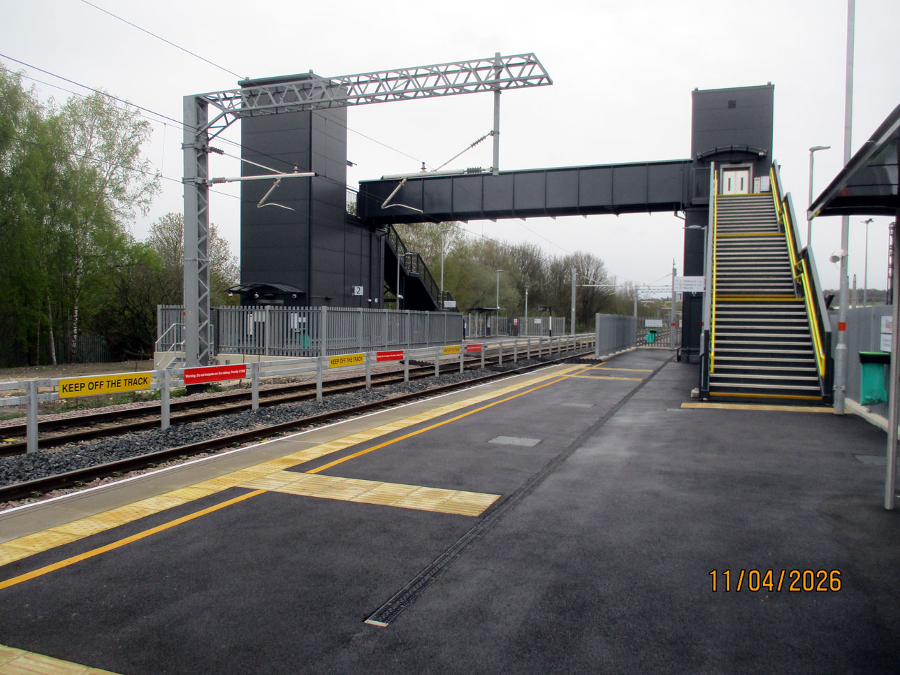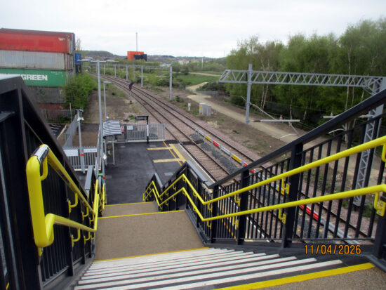 The platforms are staggered here as we see here taken from the Sheffield bound platform towards the Rotherham one with the footbridge also seen. Also note that similar to Rotherham Central the small barrier between the tracks is there to prevent people from taking a short-cut. (All Photographs by Stuart Cooke, 11th April 2026)