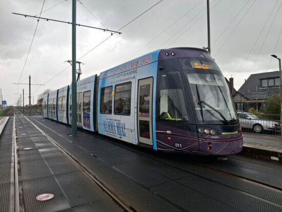 The logos have continued to be added to trams. As seen in this view of 011 (Mamma Mia! side) some of the trams received the “UK Tram Operator of the Year” sticker before the Blackpool Tramway logo. This was 15th April at Rossall Beach. The tram has now received the second sticker.